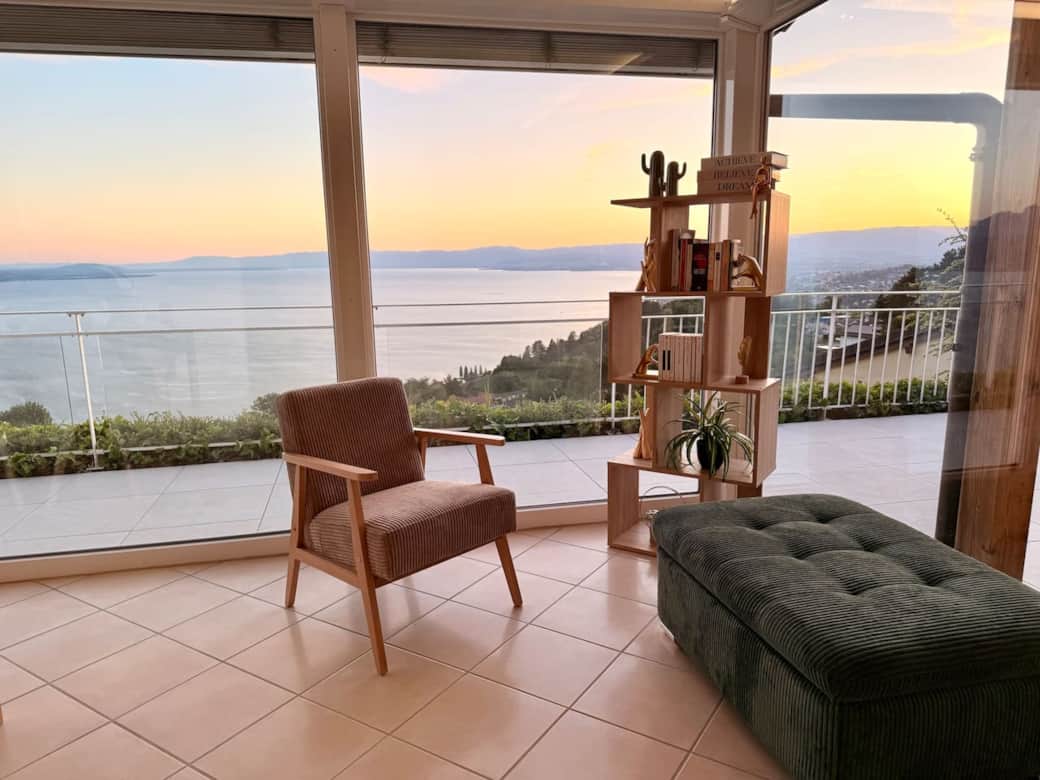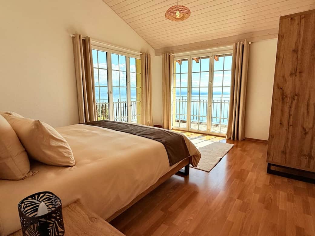 Enjoy a unique stay with a natural spectacle in this elegant villa with panoramic views of Lake Geneva. Located in the heart of Lavaux (UNESCO), it offers 4 bedrooms, a sunroom with lake view, a large terrace with private jacuzzi, a cozy living room with fireplace, and all the comforts for a relaxing stay. Just 15 min from Lausanne, 20 min from Montreux Jazz Festival, and 5 min from the highway. Perfect for couples, families or friends.